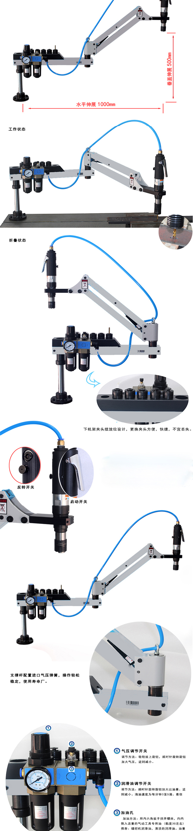 本机采用压缩空气驱动,安全快速高效;较小气压力和气量(0.6-0.8mpa),超大扭力输出;.能对各种钢材、铁、铜、铝、塑料等材料攻丝;筒夹带过载保护装置,丝攻损伤较少,螺牙精度高;操作简单轻便,完全不需要经验和技术。